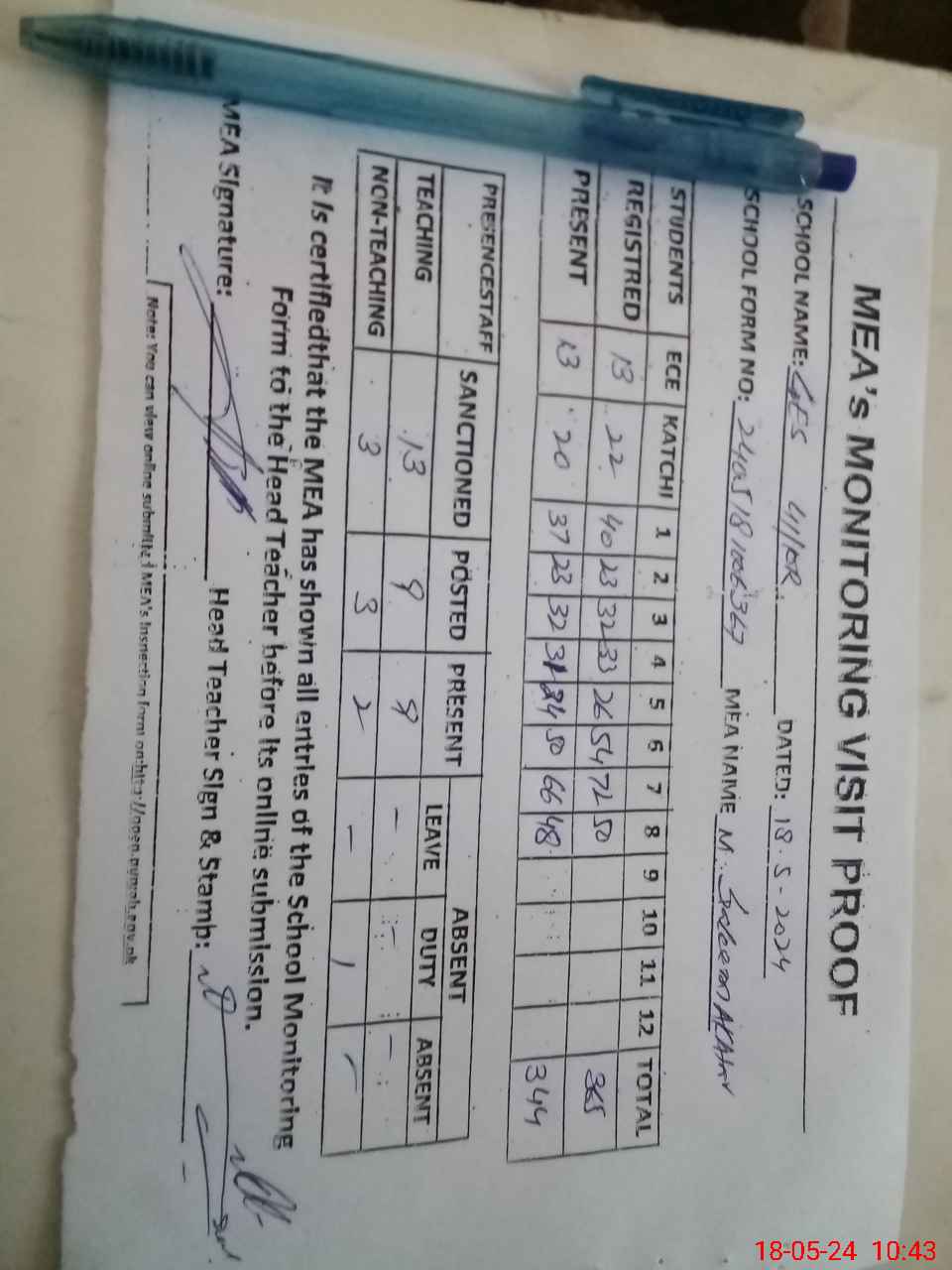 | Attendance Register | Head Teacher | MEA with School | Visit Proof |