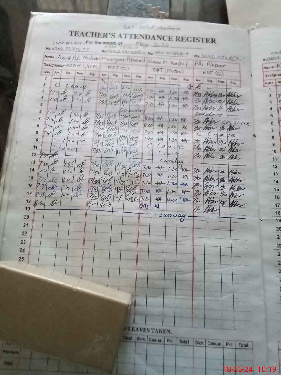 | CNIC | Full Name | Designation | R/C | Absence during last cal. month |
