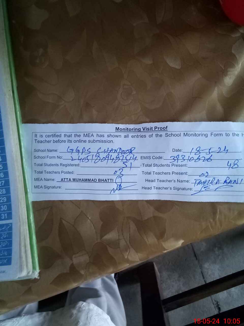 | EMIS Code: 39310626 | Name of School: GGPS CHANDOOR VIA BASEER PUR | |||