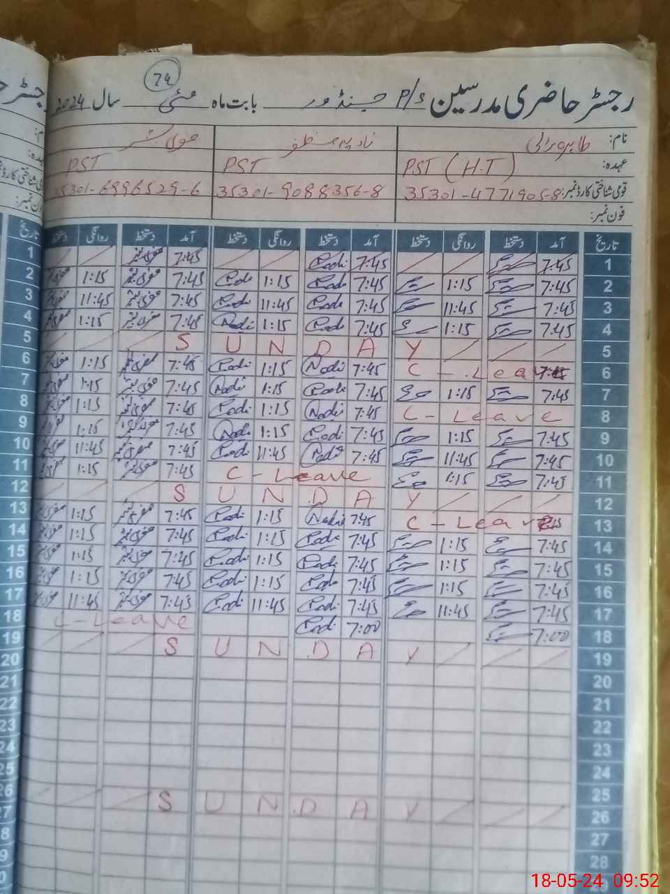 | CNIC | Full Name | Designation | R/C | Absence During Last Calender Month |