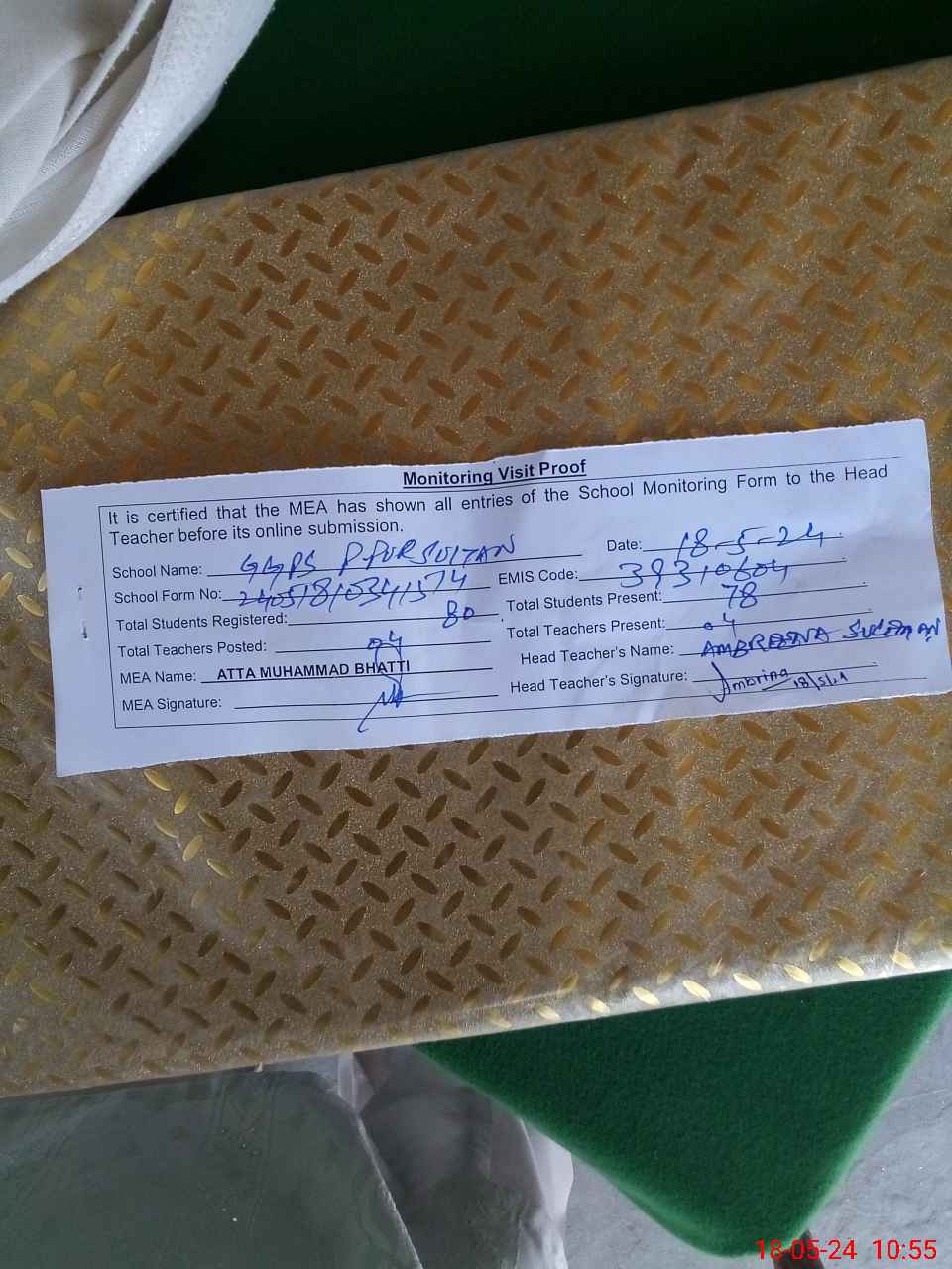 | Attendance Register | Head Teacher | MEA with School | Visit Proof |