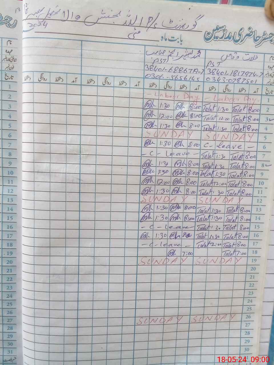 | CNIC | Full Name | Designation | R/C | Absence During Last Calender Month |