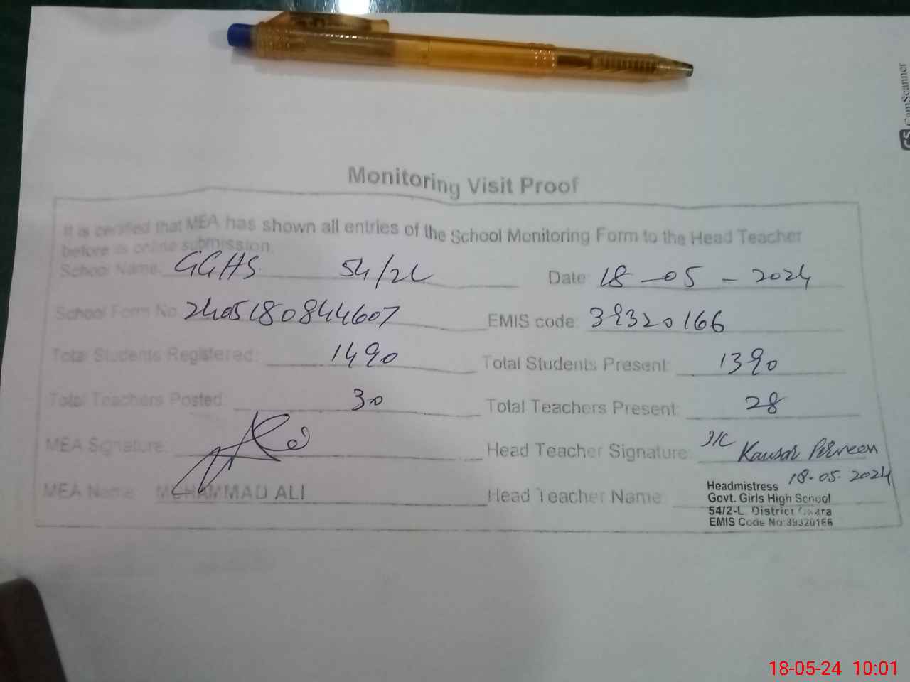 | Attendance Register | Head Teacher | MEA with School | Visit Proof |