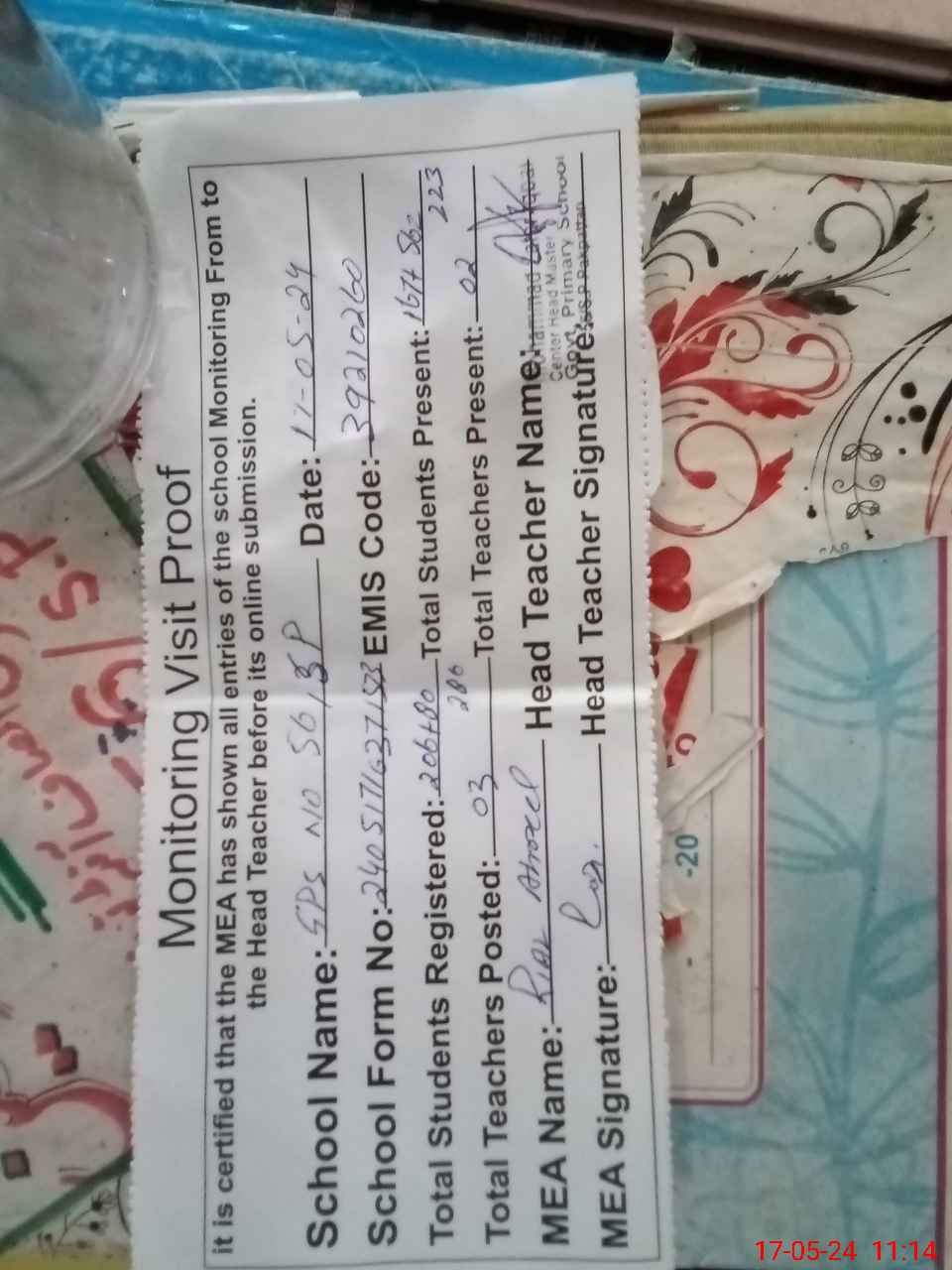 | Attendance Register | Head Teacher | MEA with School | Visit Proof |