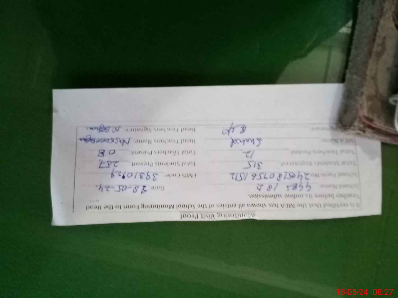 | Attendance Register | Head Teacher | MEA with School | Visit Proof |