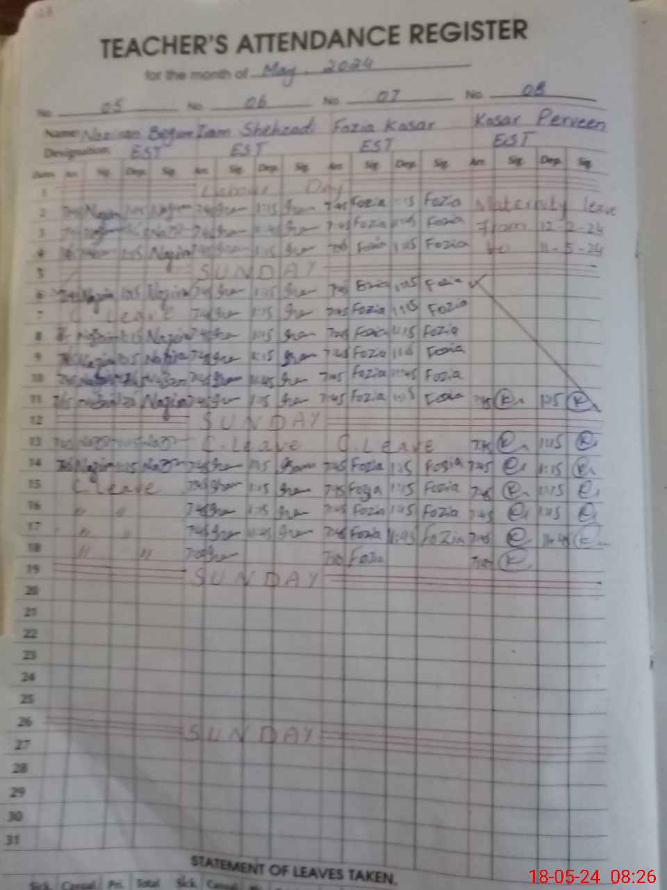 | Leave | Duty | Absent | Maternity | Medical | Ex- Pak |