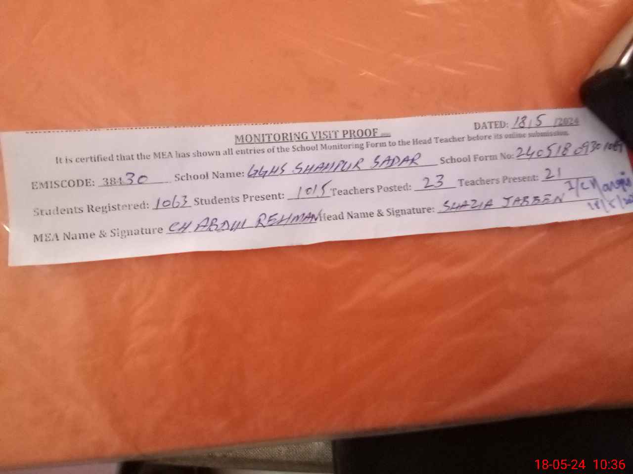 | Attendance Register | Head Teacher | MEA with School | Visit Proof |
