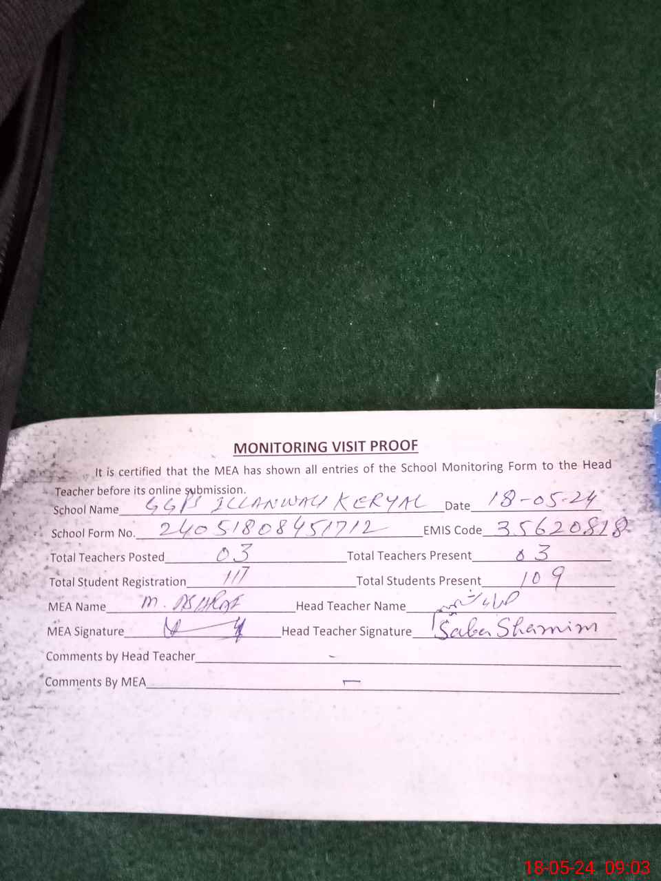 | Attendance Register | Head Teacher | MEA with School | Visit Proof |