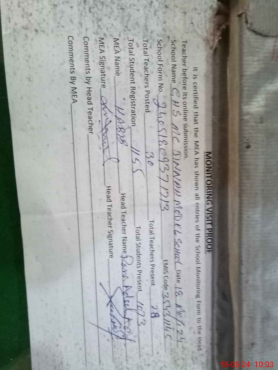 | Certified that this School was Inspected by the Undersigned MEA/DMO Today and the Information Stated Above is as Per Record. | |||||