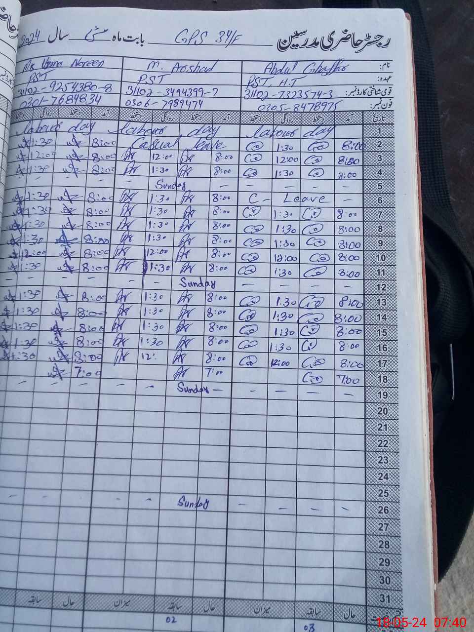 | CNIC | Full Name | Designation | R/C | Absence During Last Calender Month |