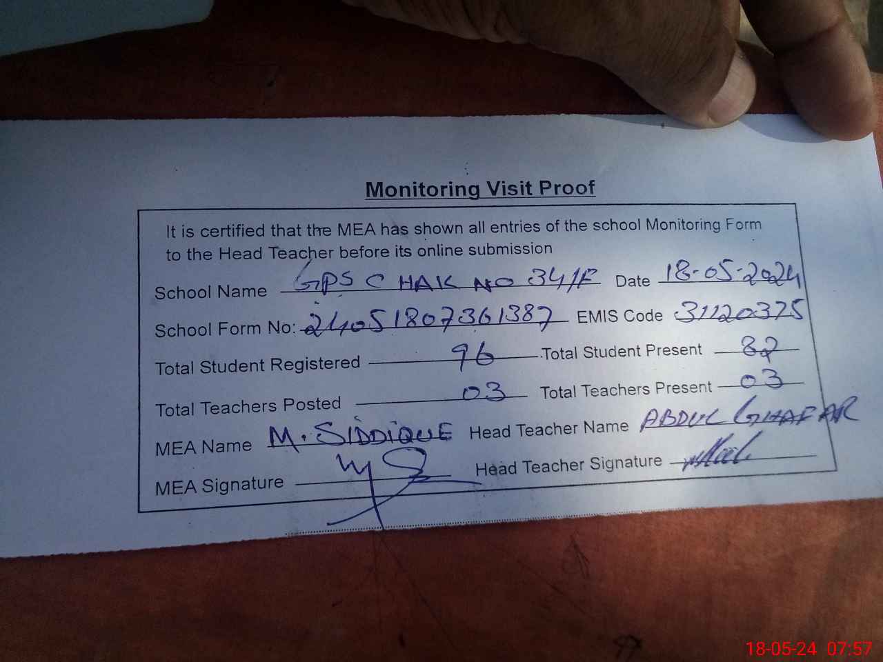 | Attendance Register | Head Teacher | MEA with School | Visit Proof |