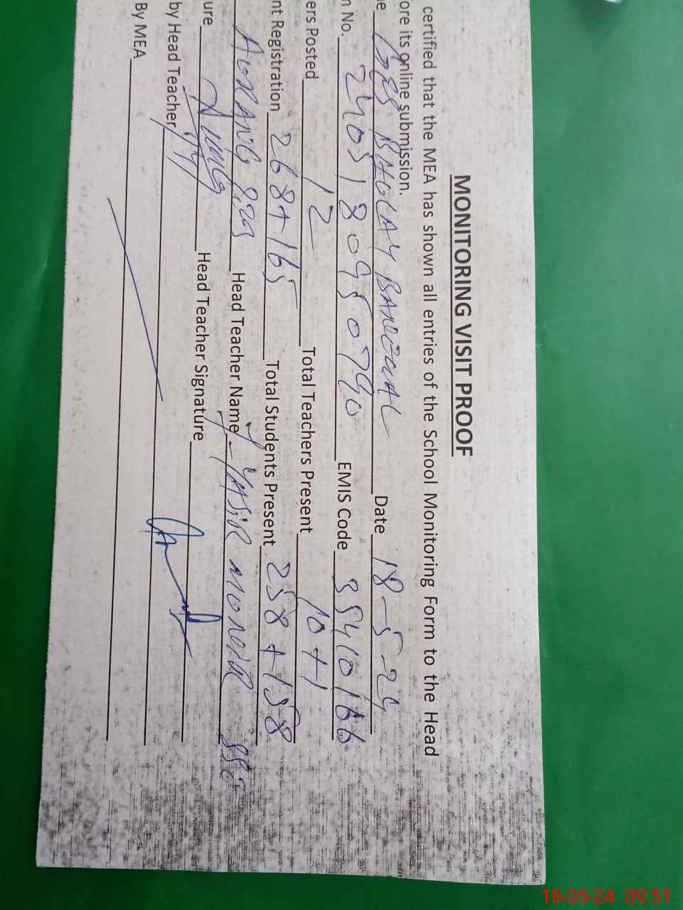 | Attendance Register | Head Teacher | MEA with School | Visit Proof |