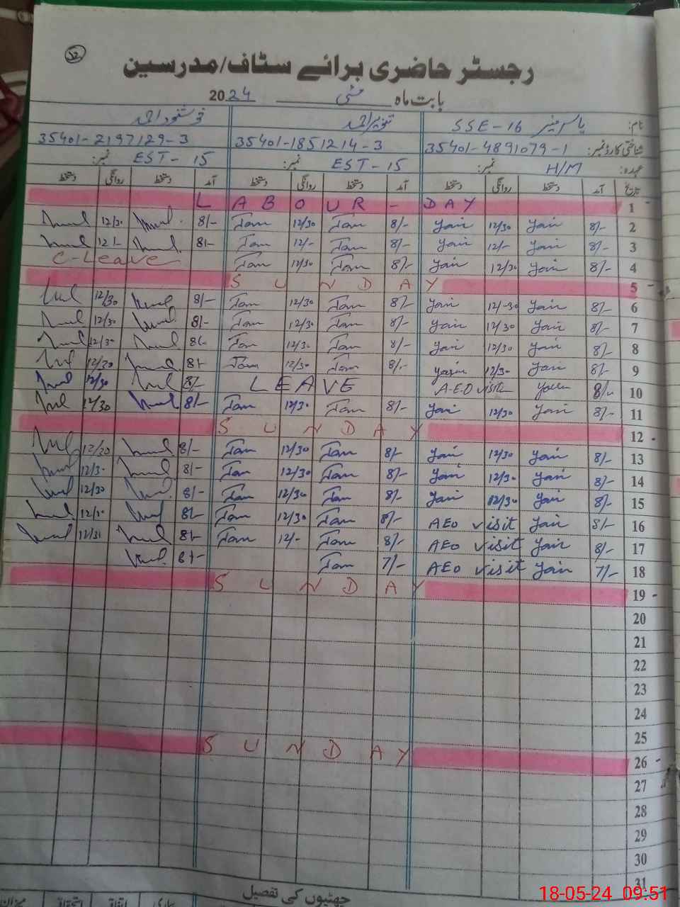 | CNIC | Full Name | Designation | R/C | Absence During Last Calender Month |