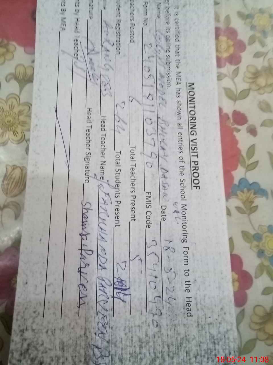 | Attendance Register | Head Teacher | MEA with School | Visit Proof |