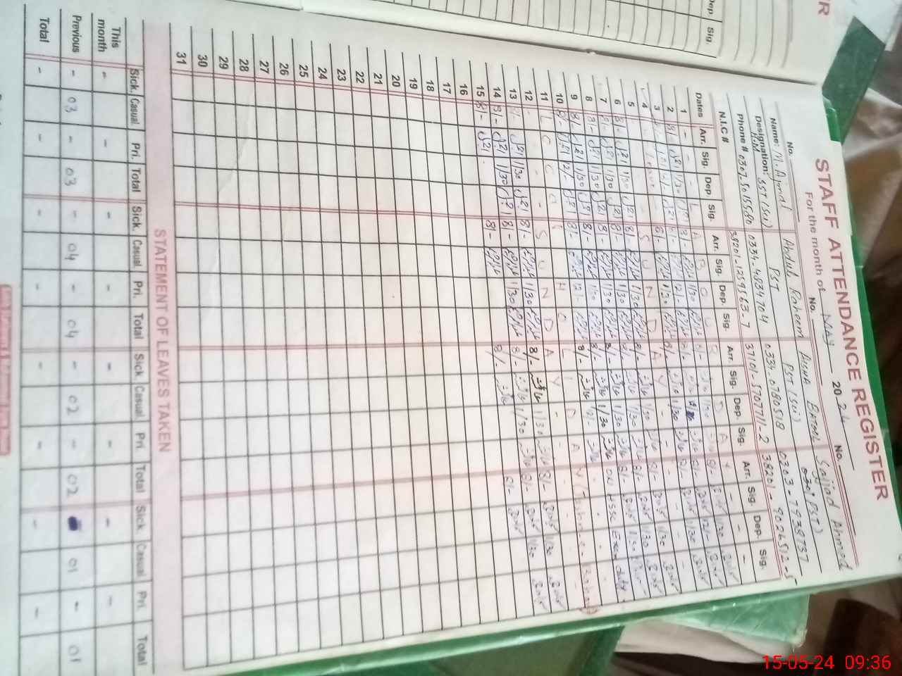 | CNIC | Full Name | Designation | R/C | Absence during last cal. month |
