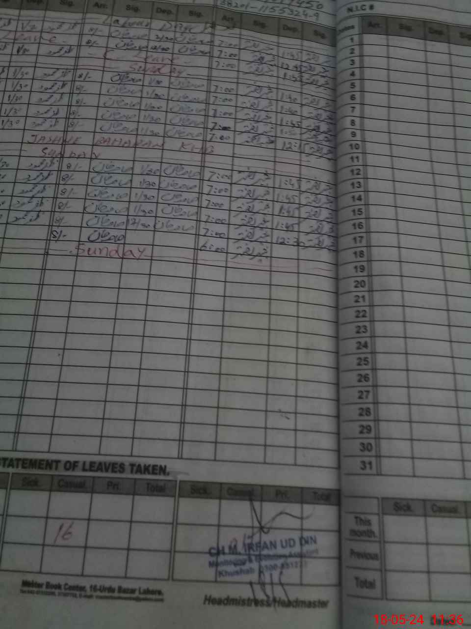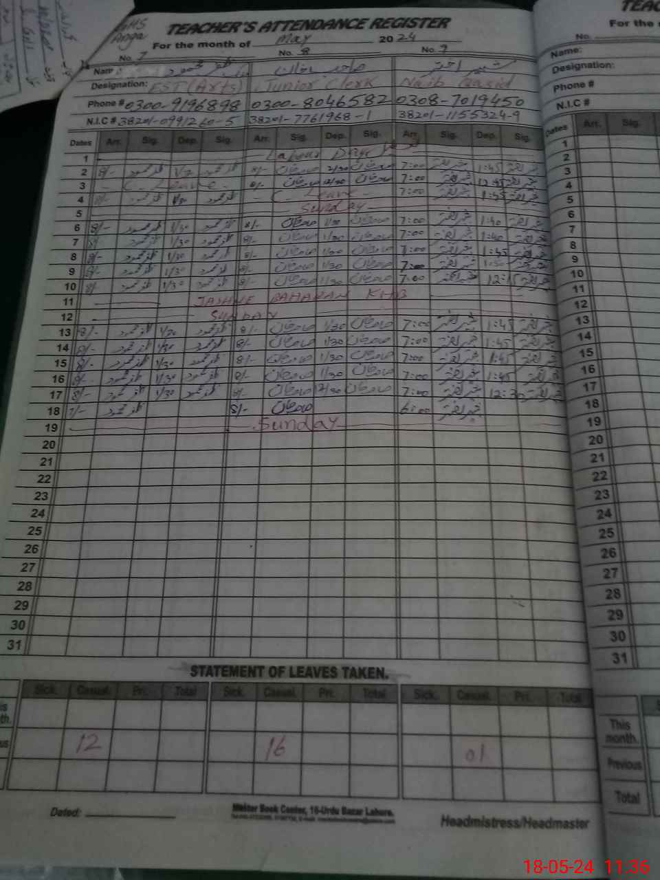 | CNIC | Full Name | Designation | R/C | Absence During Last Calender Month |