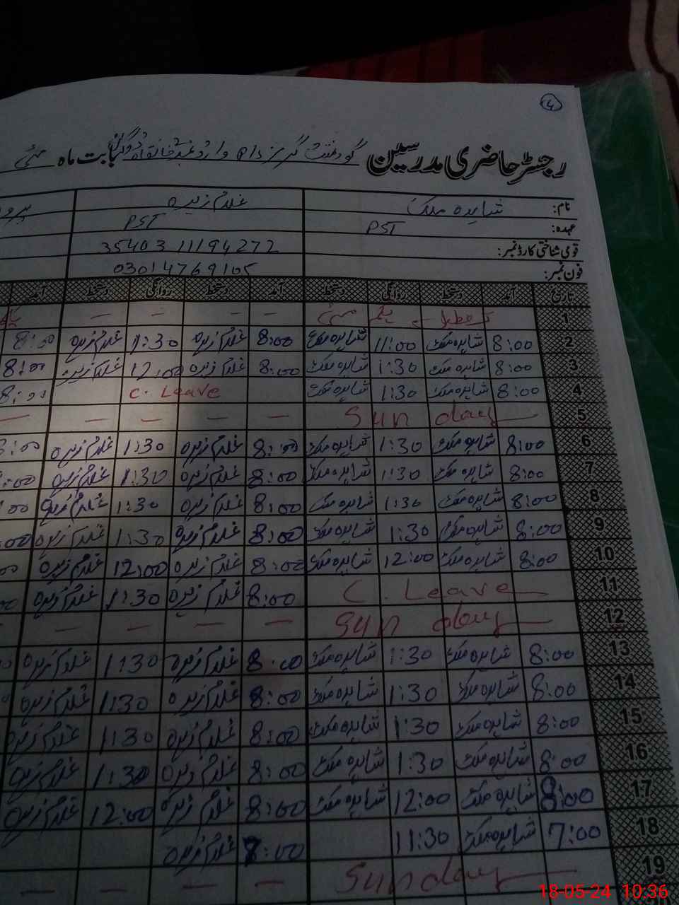 | CNIC | Full Name | Designation | R/C | Absence During Last Calender Month |