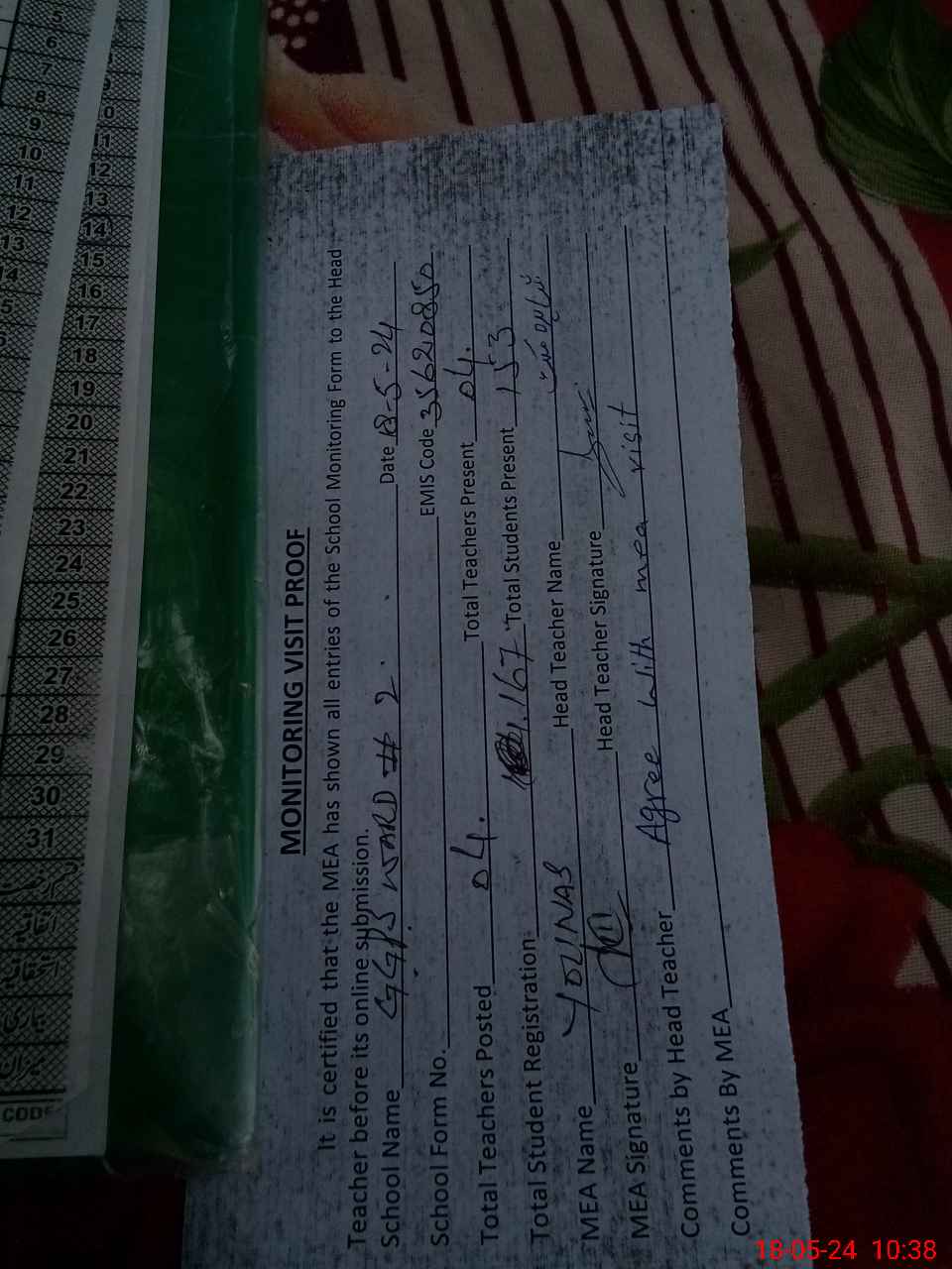 | Attendance Register | Head Teacher | MEA with School | Visit Proof |