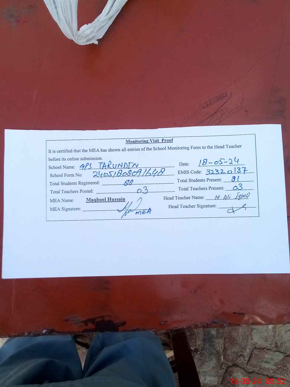 | Attendance Register | Head Teacher | MEA with School | Visit Proof |