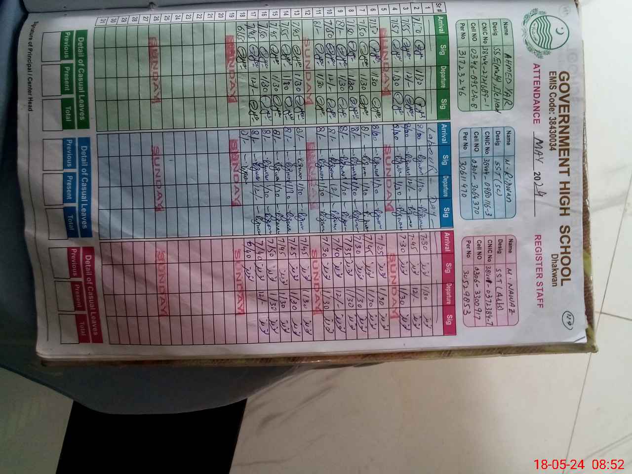 | CNIC | Full Name | Designation | R/C | Absence during last cal. month |
