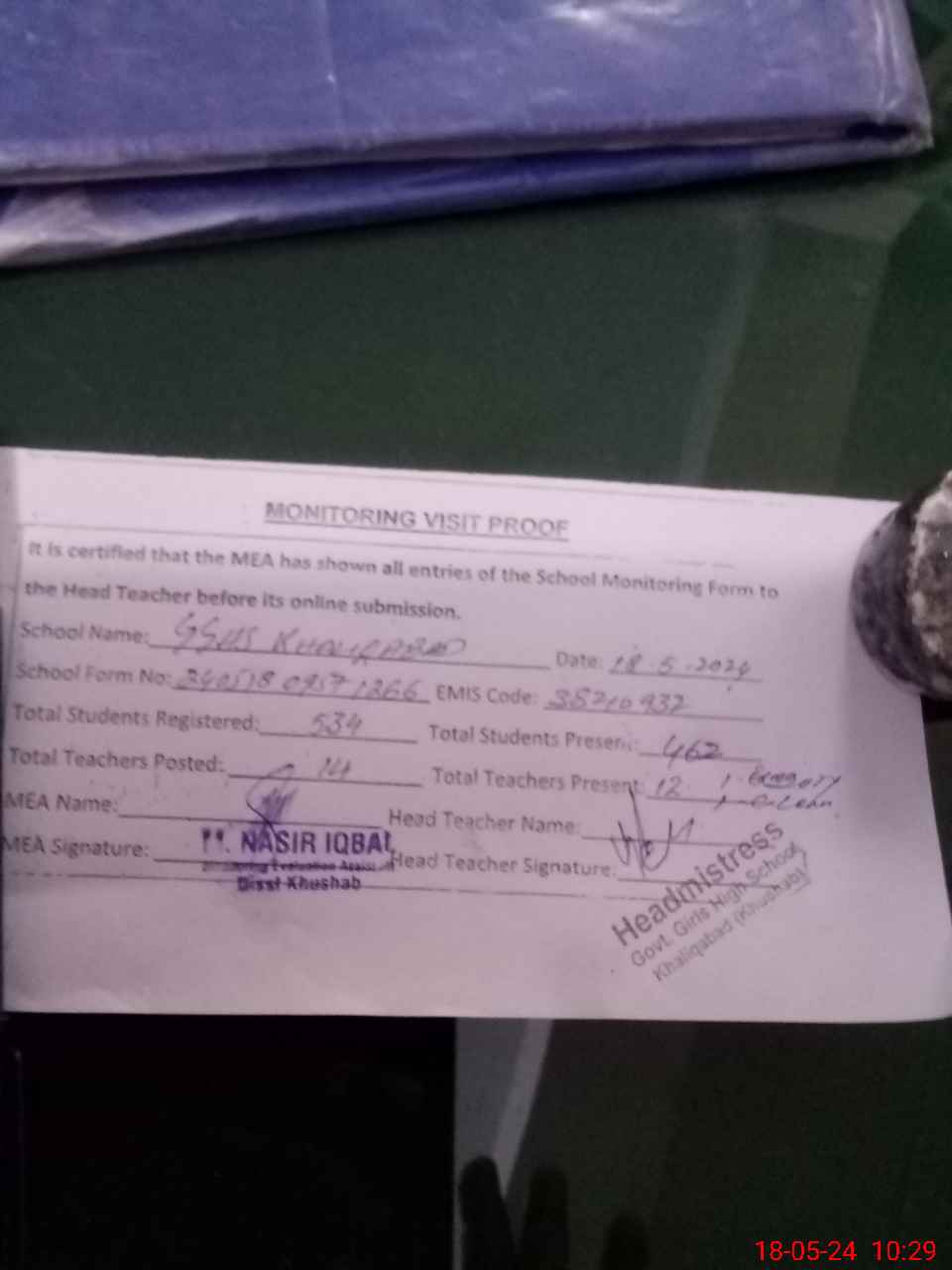 | Attendance Register | Head Teacher | MEA with School | Visit Proof |