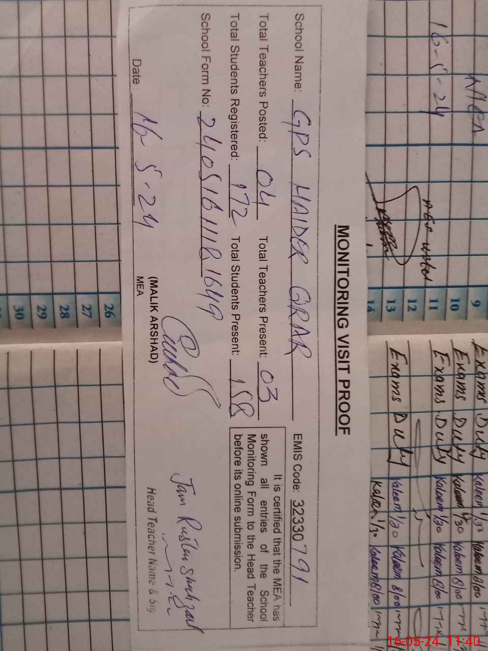 | Attendance Register | Head Teacher | MEA with School | Visit Proof |