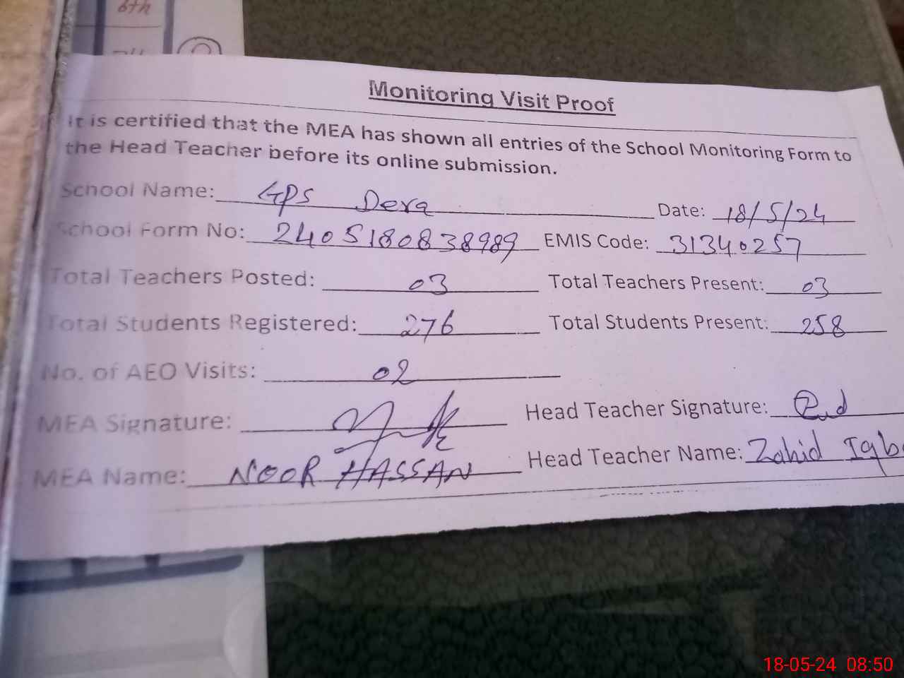 | Attendance Register | Head Teacher | MEA with School | Visit Proof |