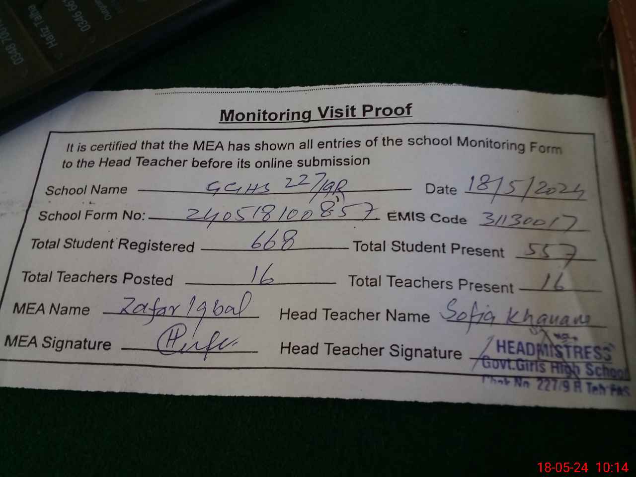 | Attendance Register | Head Teacher | MEA with School | Visit Proof |