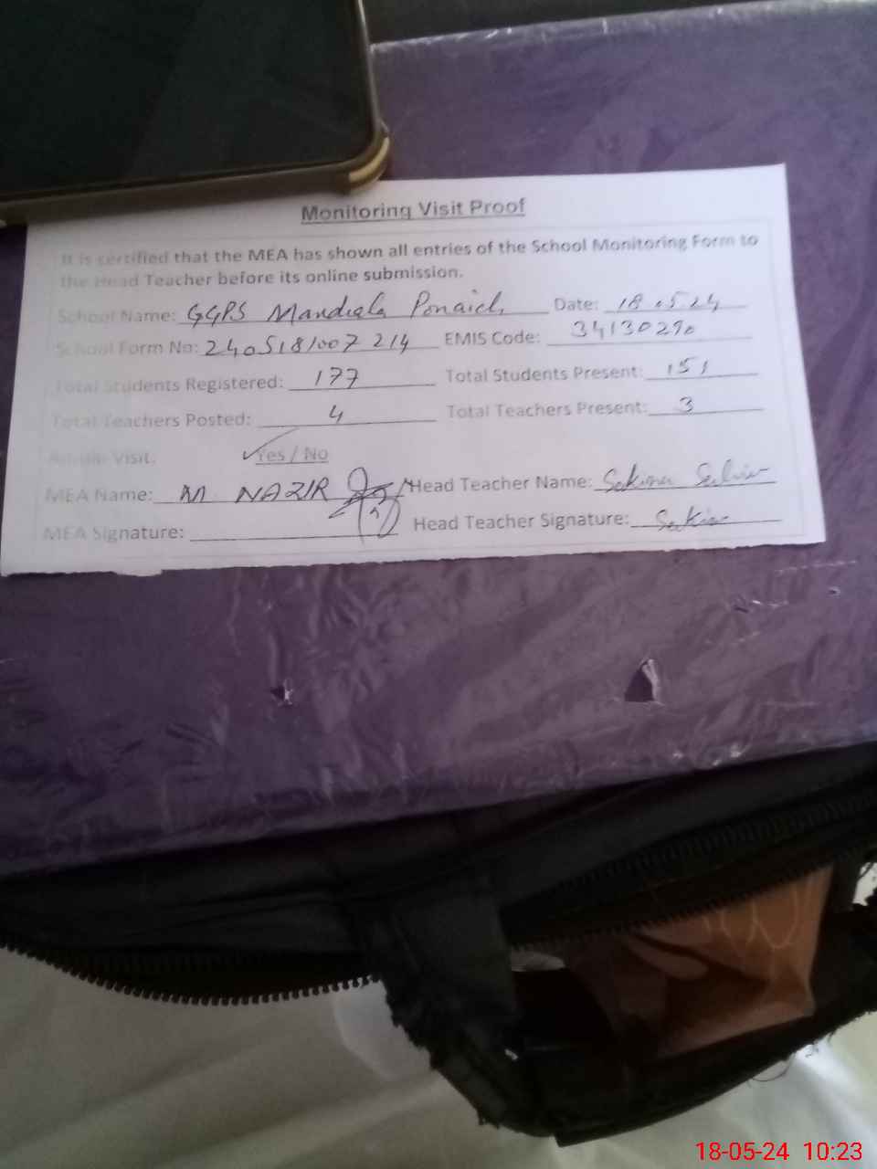 | Attendance Register | Head Teacher | MEA with School | Visit Proof |