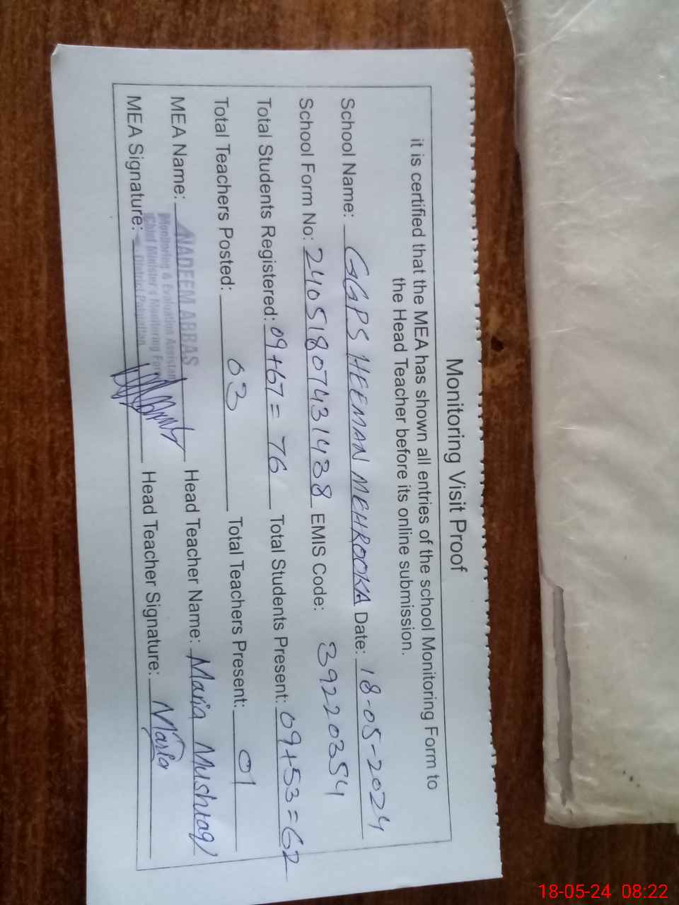 | Attendance Register | Head Teacher | MEA with School | Visit Proof |