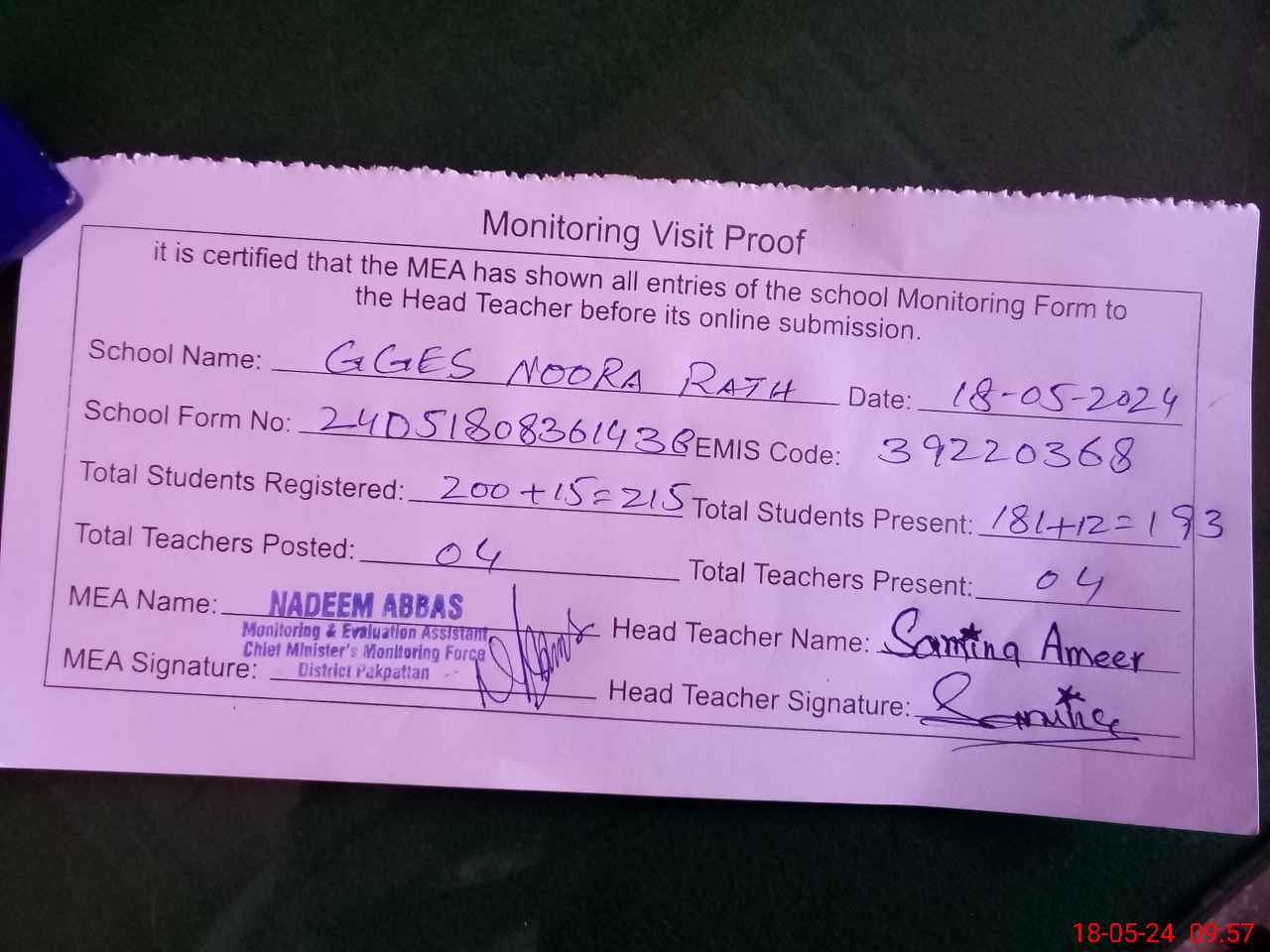 | Attendance Register | Head Teacher | MEA with School | Visit Proof |