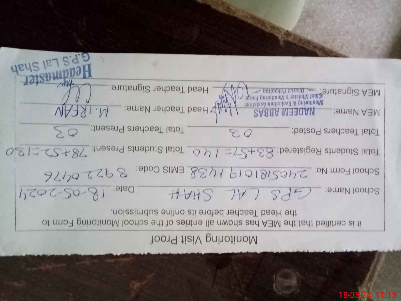| Attendance Register | Head Teacher | MEA with School | Visit Proof |