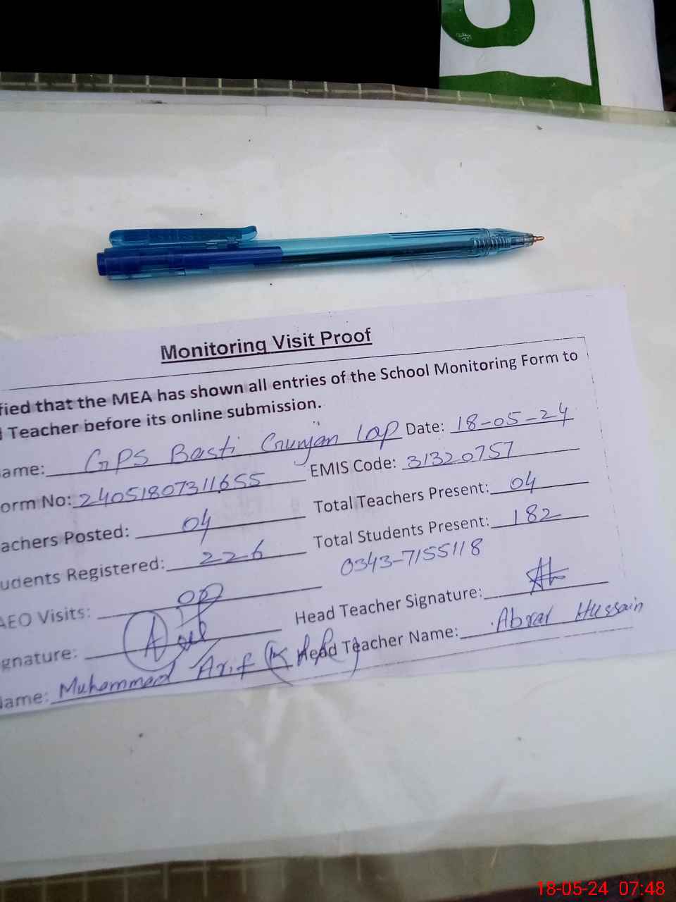 | Name: Ab**** Re**** Designation: (School Headmaster's/Headmistress's) PST Phone/Cell Number: 03**** |
