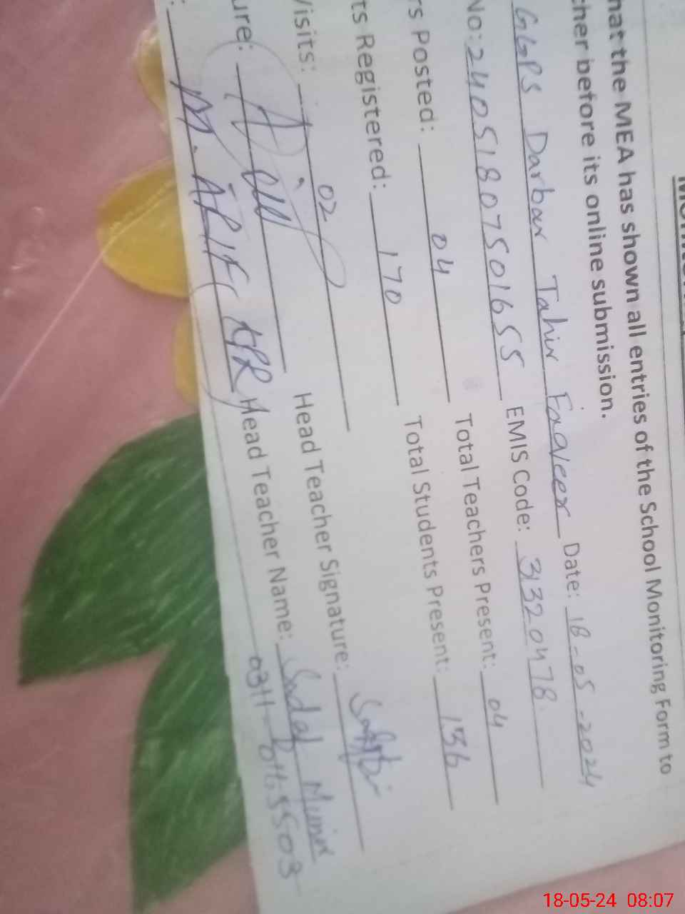 | Attendance Register | Head Teacher | MEA with School | Visit Proof |
