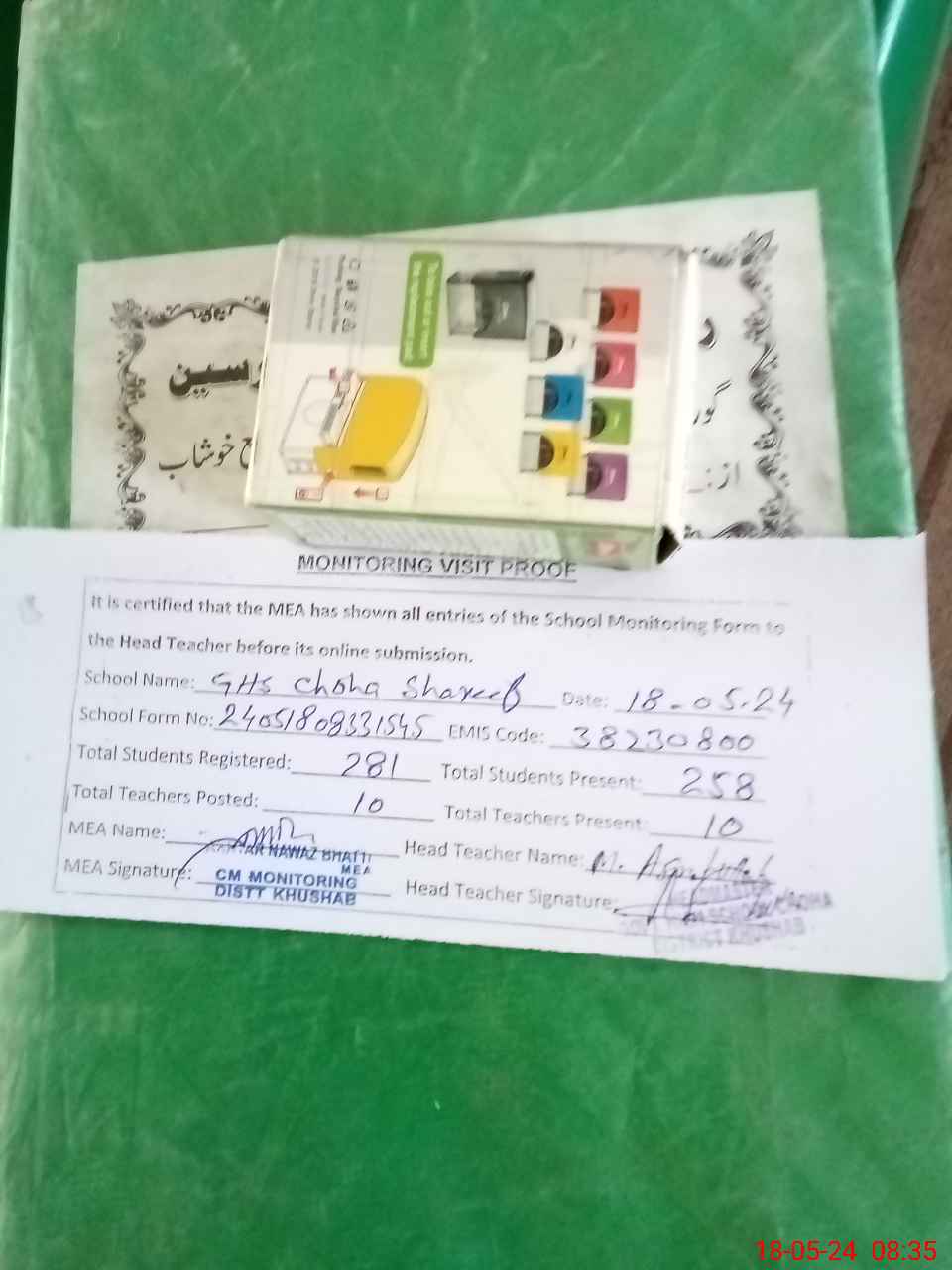 | Attendance Register | Head Teacher | MEA with School | Visit Proof |