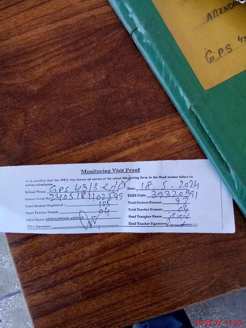 | EMIS Code: 39320391 | Name of School: GPS CHAK NO. 43/3-R KARAM PUR | |||