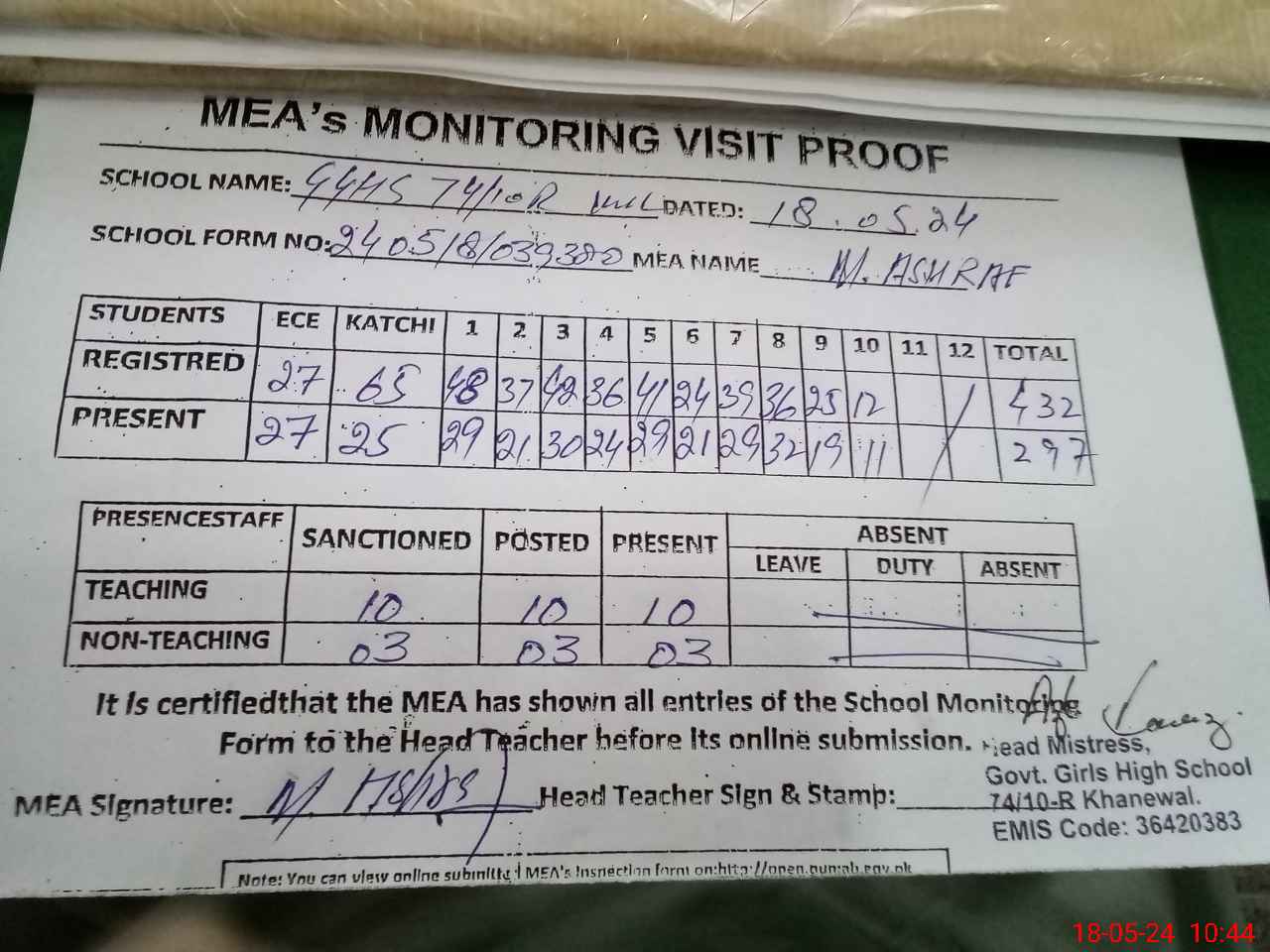 | EMIS Code: 36420383 | Name of School: GGHS 74/10-R, KHANEWAL | |||