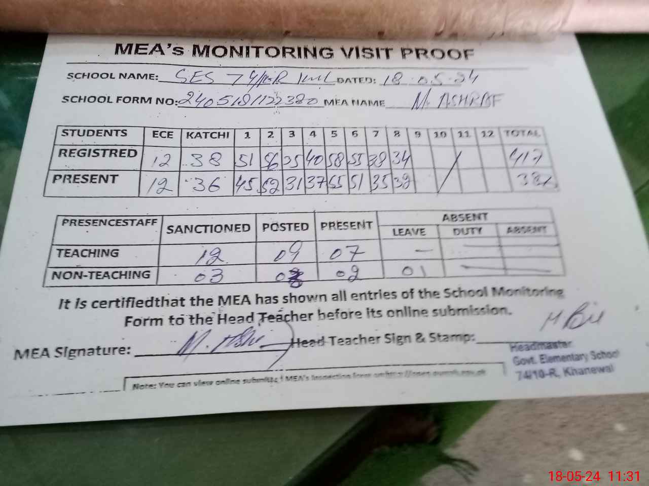 | EMIS Code: 36420064 | Name of School: GES 74/10-R, KHANEWAL | |||