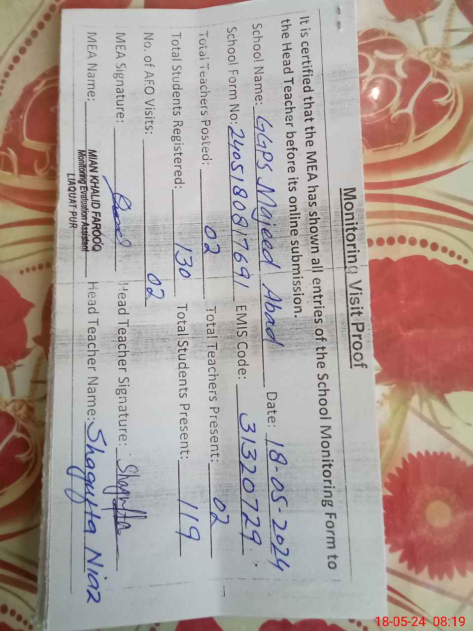 | Attendance Register | Head Teacher | MEA with School | Visit Proof |