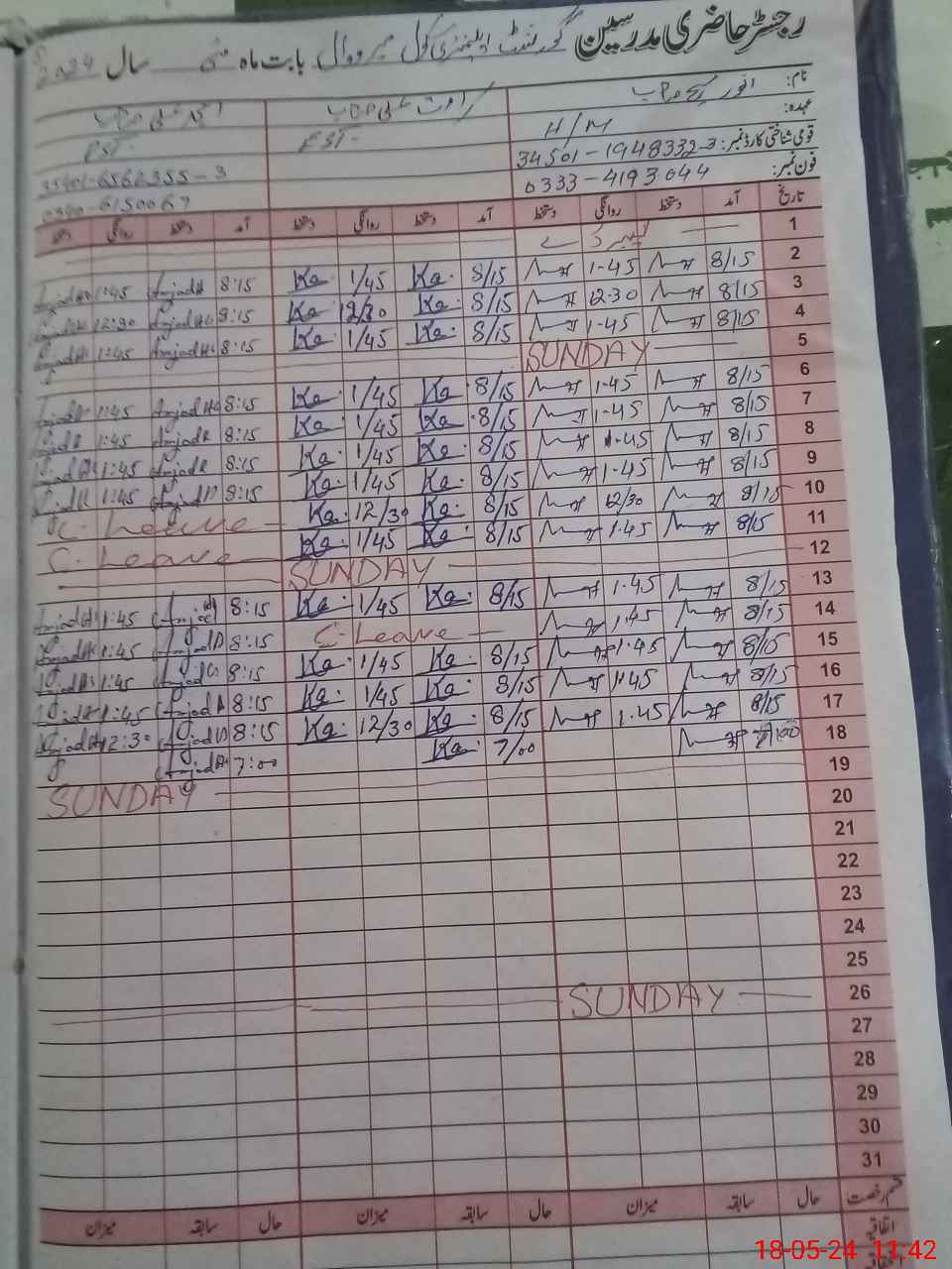 | CNIC | Full Name | Designation | R/C | Absence During Last Calender Month |