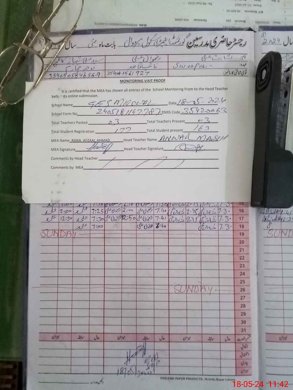 | Attendance Register | Head Teacher | MEA with School | Visit Proof |