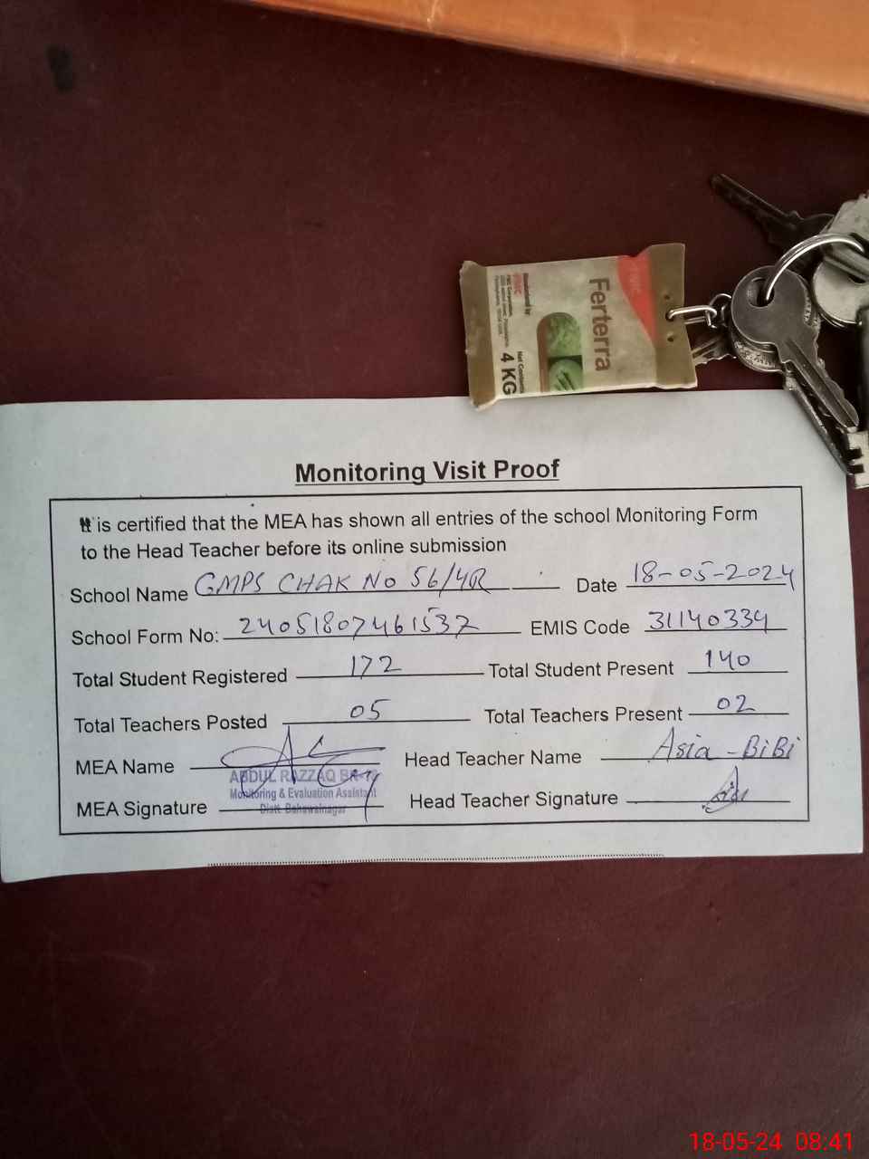 | EMIS Code: 31140334 | Name of School: GMPS CHAK NO. 56/4-R | |||