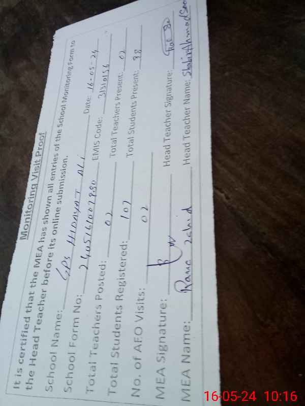 | Attendance Register | Head Teacher | MEA with School | Visit Proof |