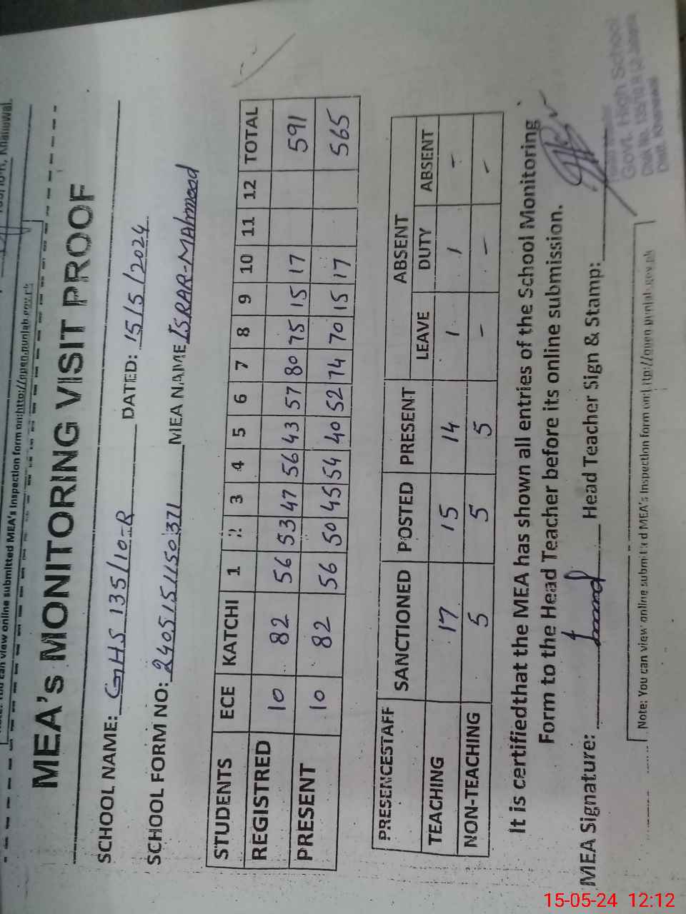 | Certified that this School was Inspected by the Undersigned MEA/DMO Today and the Information Stated Above is as Per Record. | |||||