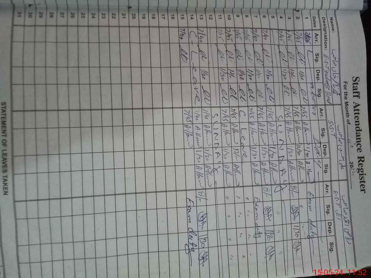 | CNIC | Full Name | Designation | R/C | Absence During Last Calender Month |