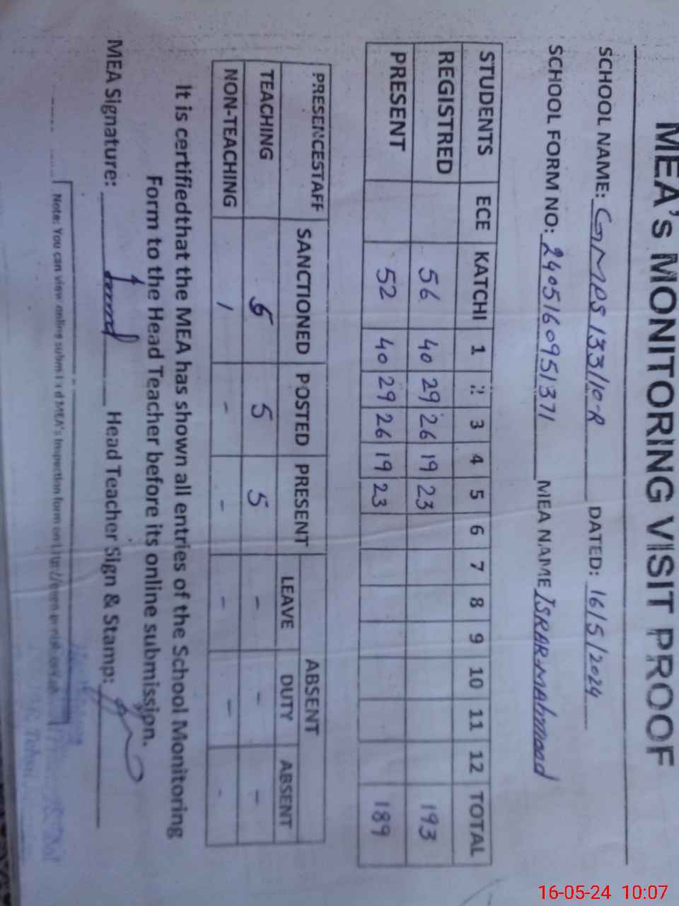 | Attendance Register | Head Teacher | MEA with School | Visit Proof |