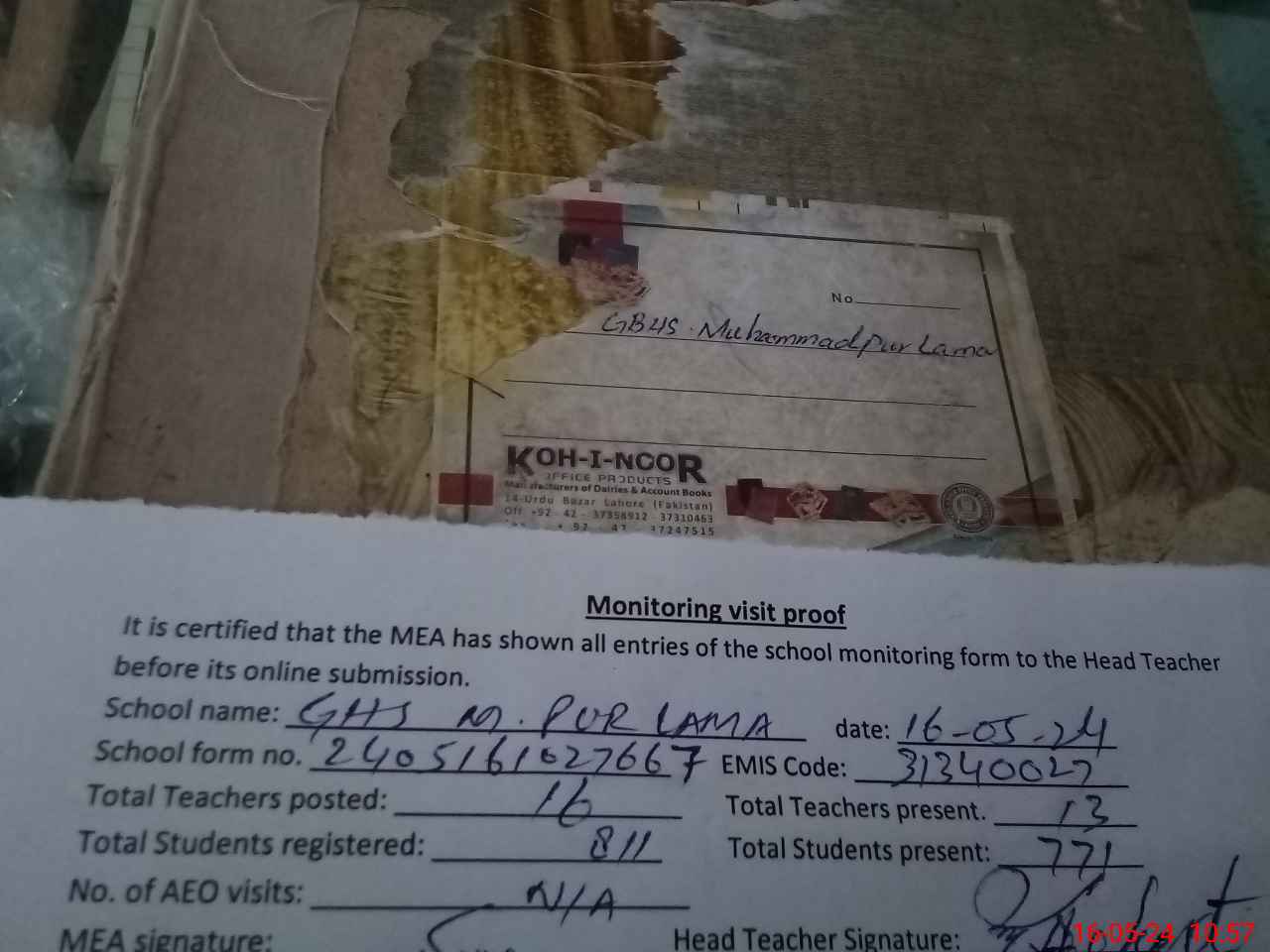 | Attendance Register | Head Teacher | MEA with School | Visit Proof |