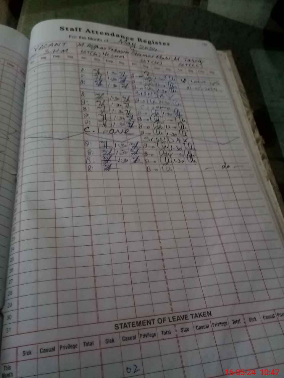 | 31**** | Ad**** Al**** | Contract | 0 | 24 | 0 | 0 | 0 | 0 | 0 | 0 | 0 | Exam Duty | |