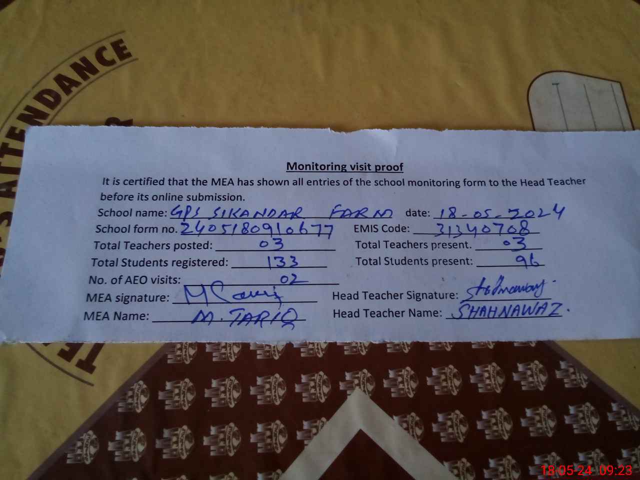 | Attendance Register | Head Teacher | MEA with School | Visit Proof |