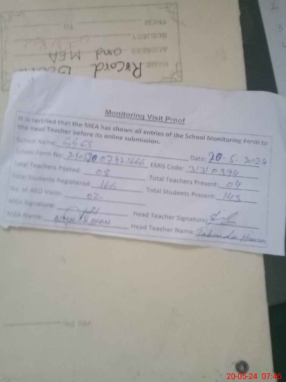 | Attendance Register | Head Teacher | MEA with School | Visit Proof |